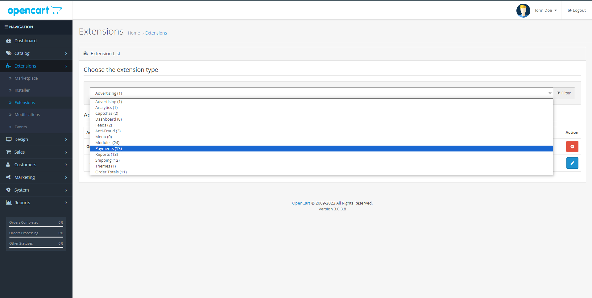 After uploading successfully, Click 'Extensions' sidemenu and select 'Payments' from Choose the extension type dropdown menu. Subsequently, install the extension by clicking on the '+' icon.