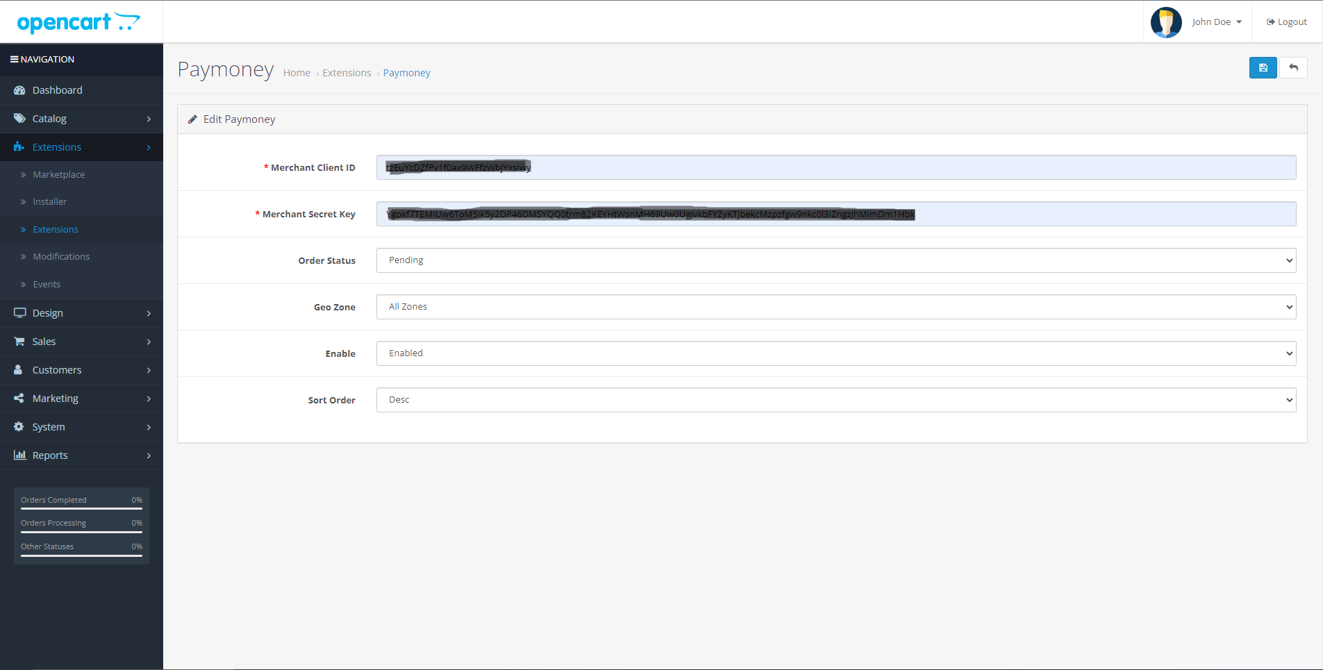 After the plugin is installed, click on the 'Edit' button and Configure the payment module with your merchant payment details and activate the extension.